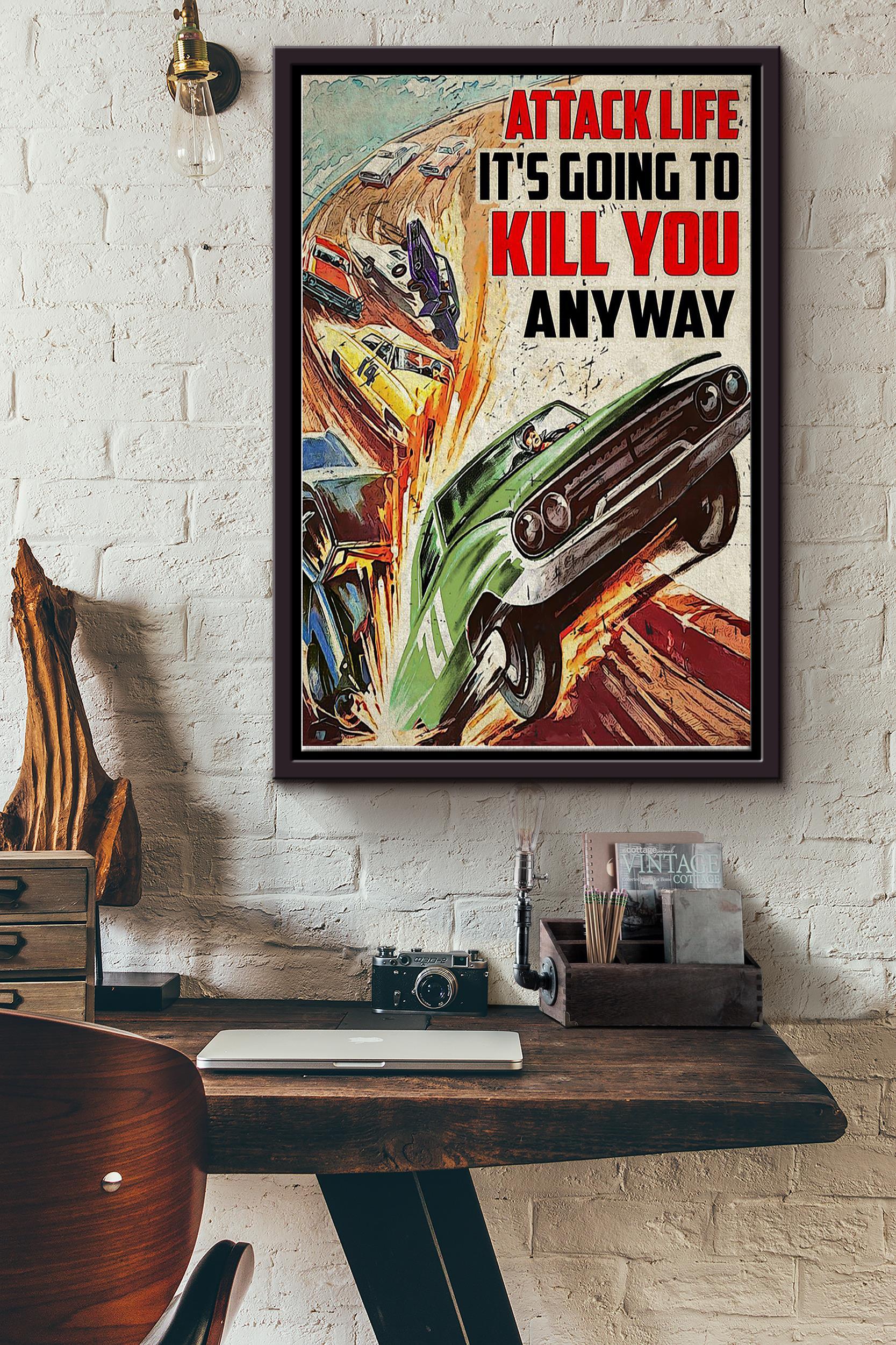 Attack Life Its Going To Kill You Stock Car Racing Poster Framed Matte Canvas