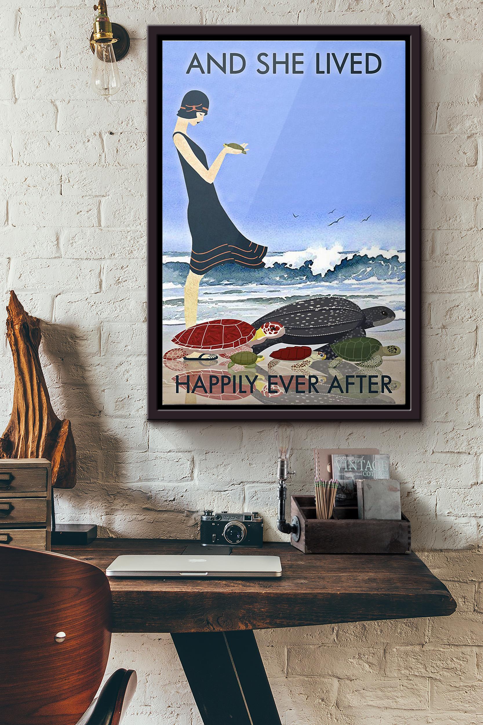 Beach And Turtles And She Lived Happily Ever After Poster Framed Matte Canvas