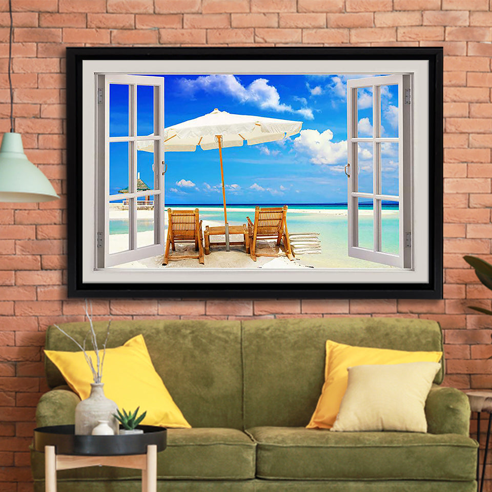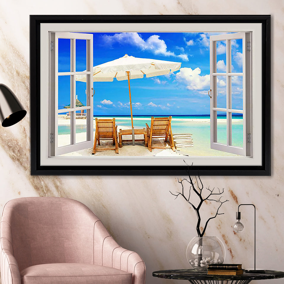 Beach Holiday 3D Window View Framed Canvas Print – Canvas Painting, Canvas Art, Wall Art, Wall Decor