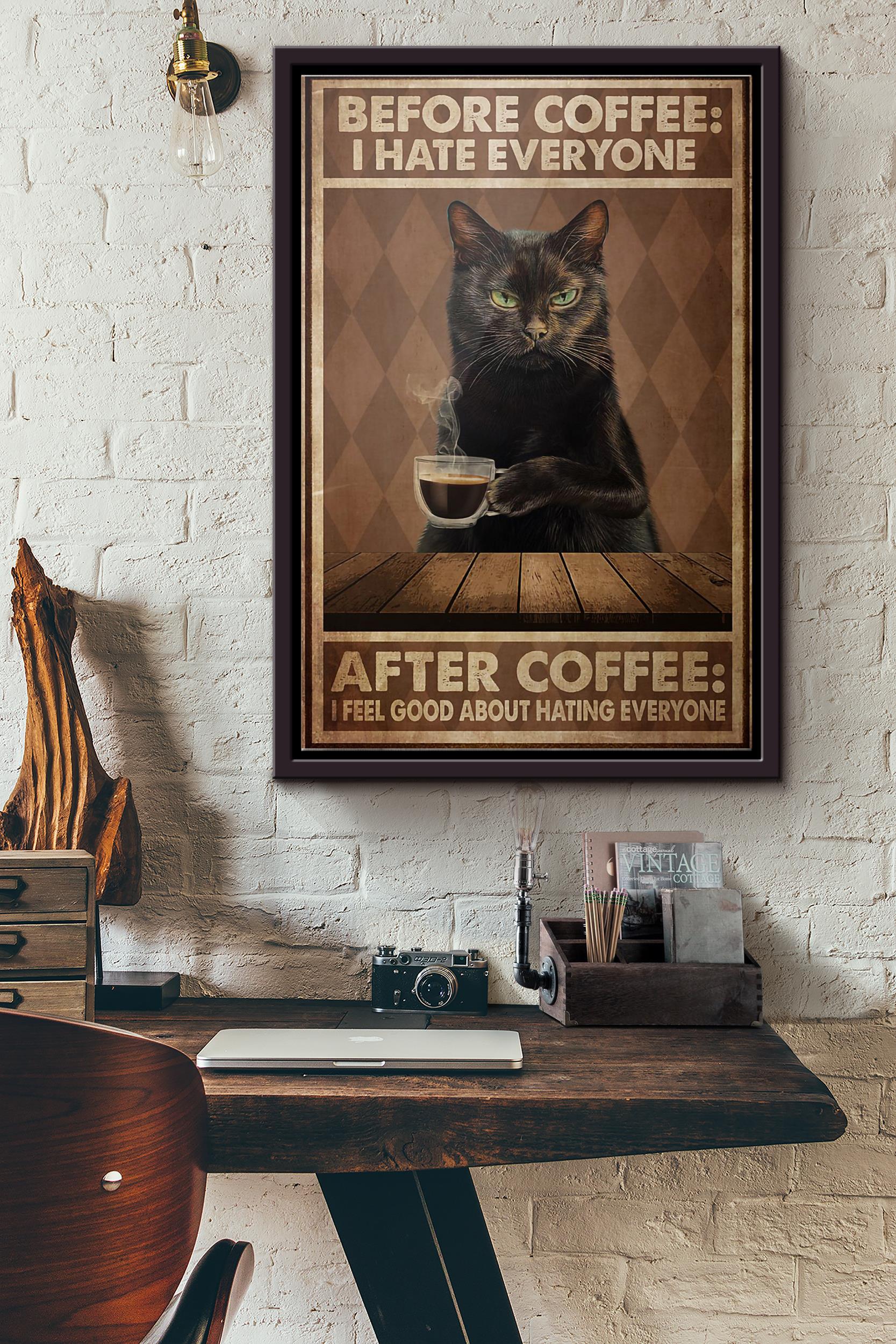 Black Cat Before Coffee I Hate Everyone After Coffee I Feel Good About Hating Everyone Poster Framed Matte Canvas