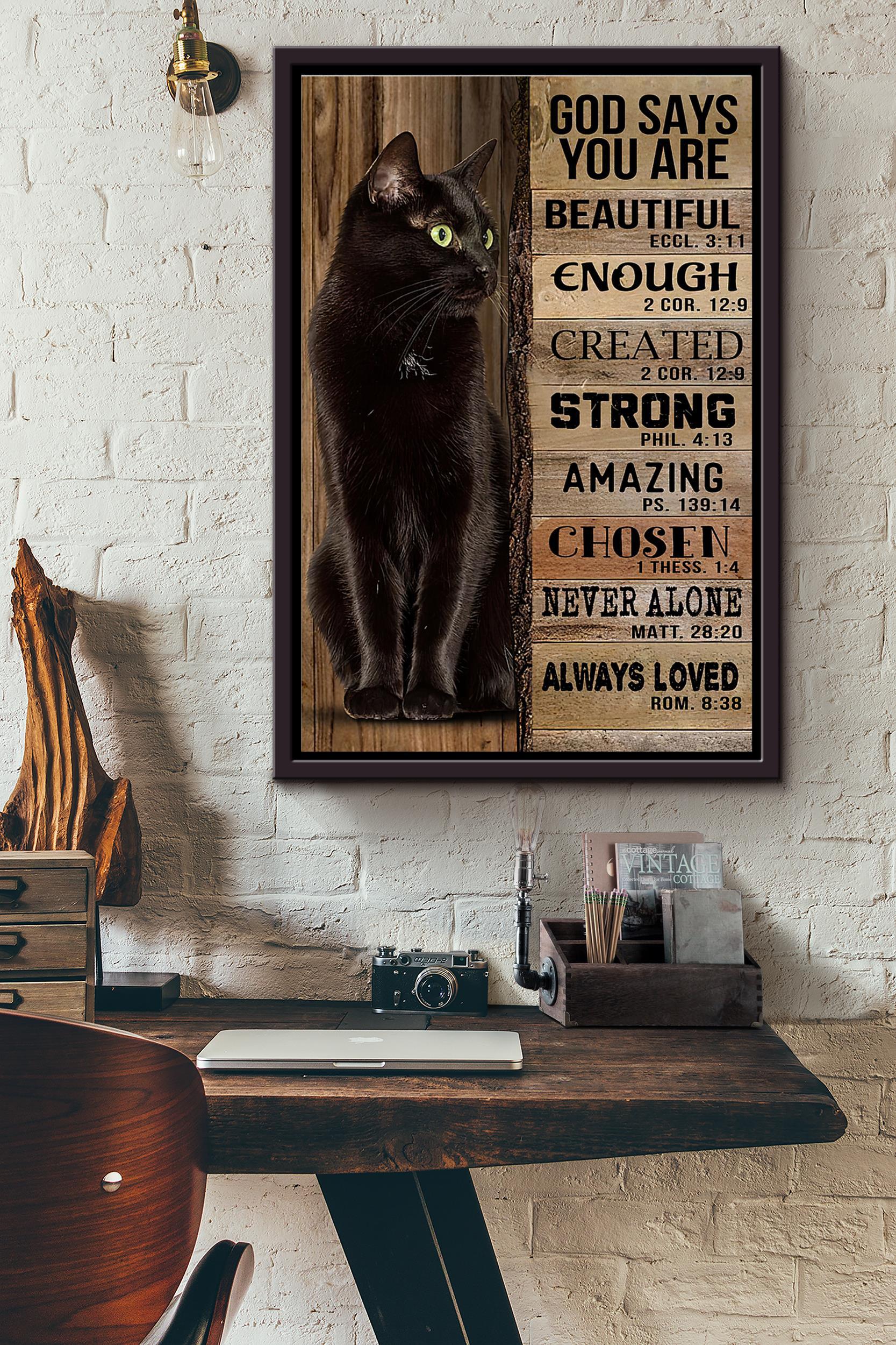 Black Cat God Says You Are Beautiful Created Strong Never Alone Always Loved Poster Framed Matte Canvas