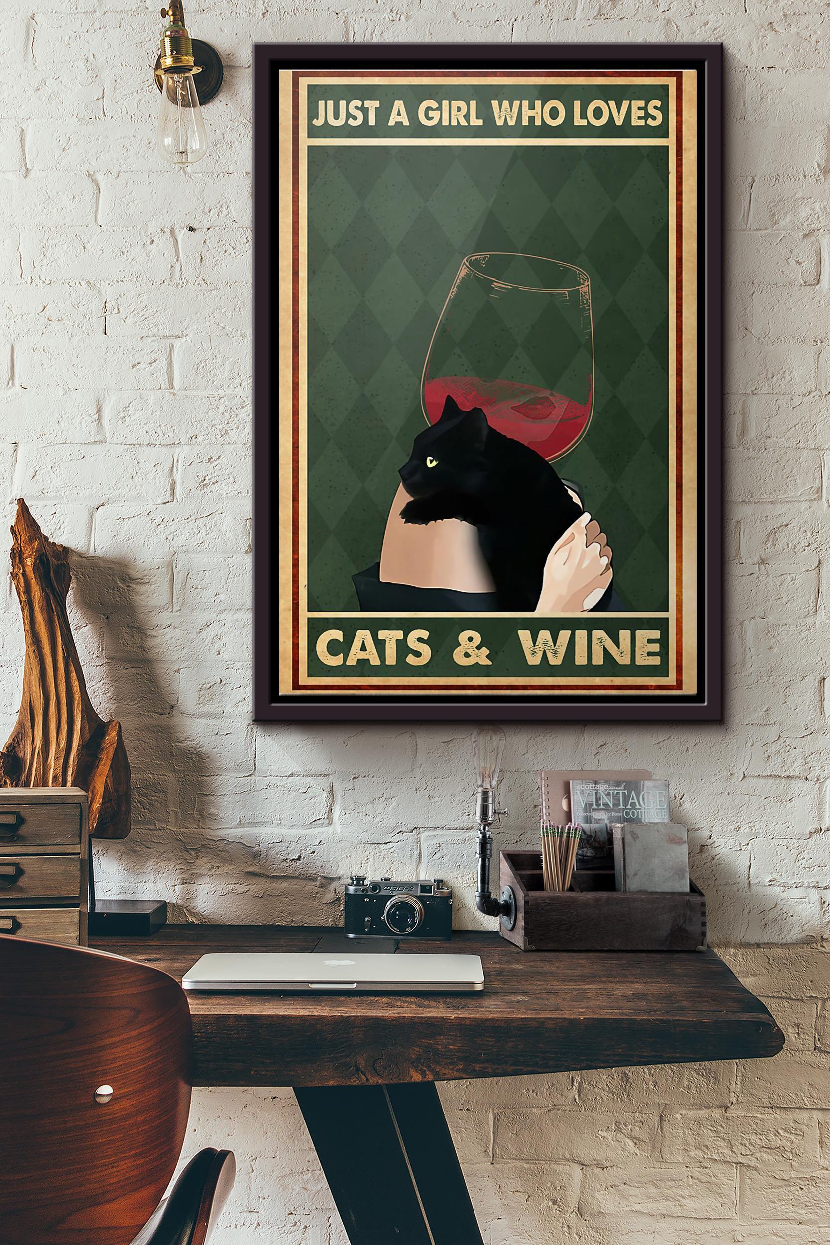 Black Cat Just A Girl Love Cats And Wine Poster Framed Matte Canvas