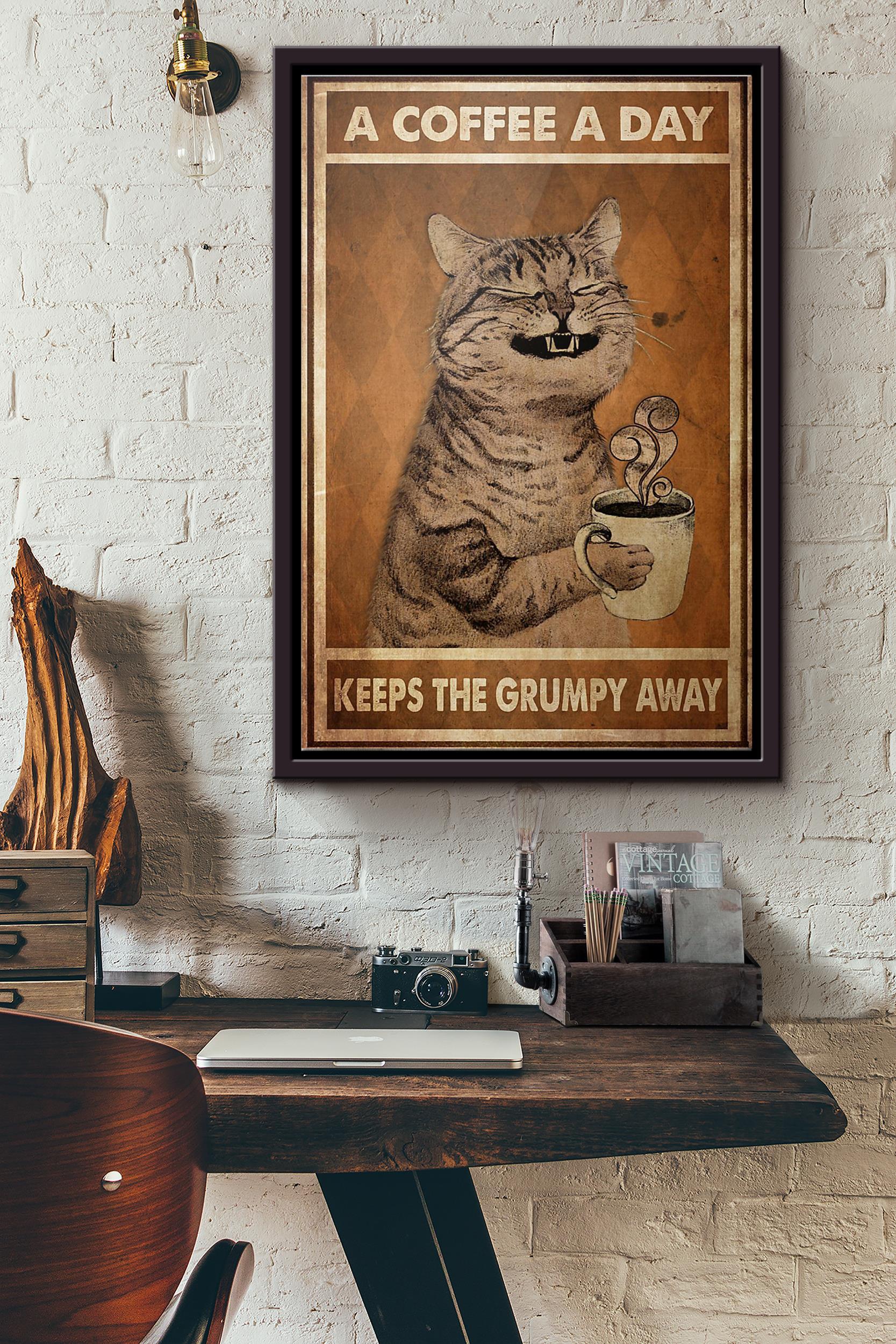 Cat A Coffee A Day Keeps The Grumpy Away Poster Framed Matte Canvas