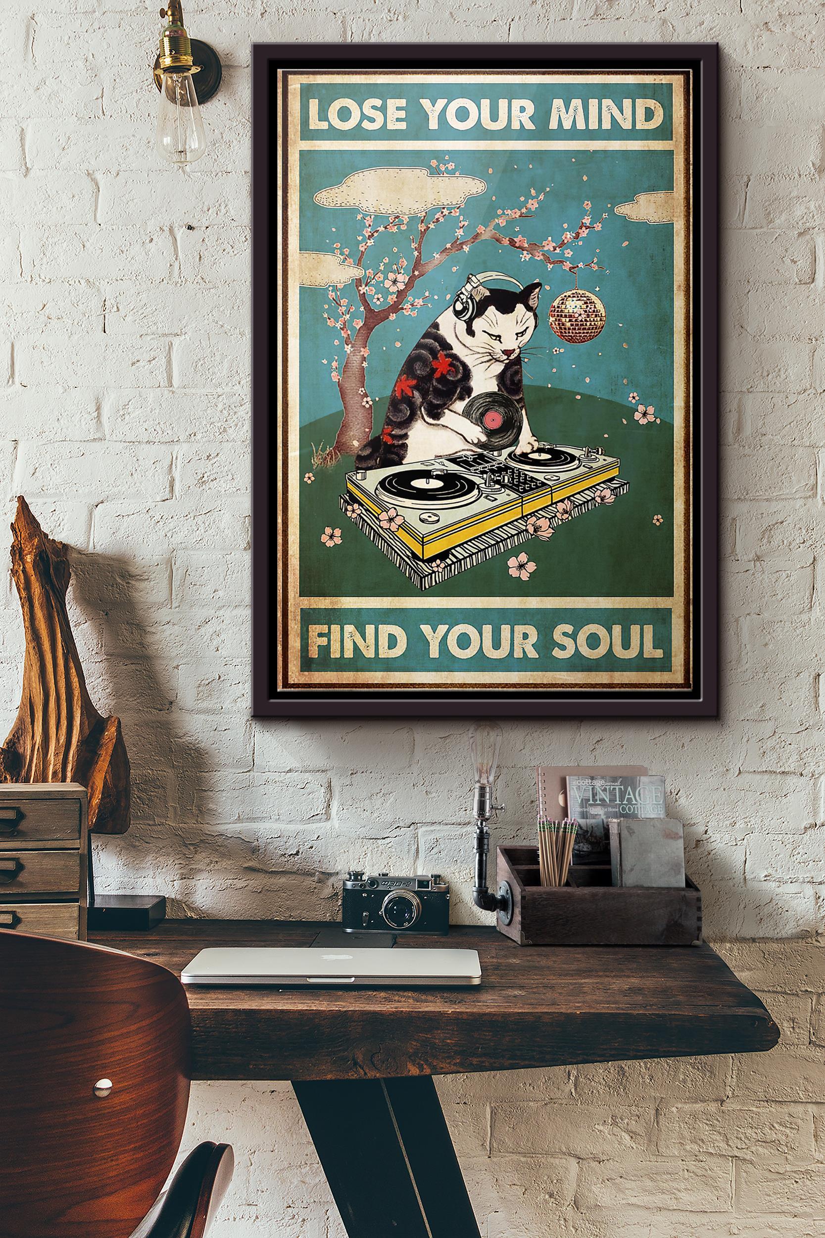 Cat Dj Lose Your Mind Find Your Soul Poster Framed Matte Canvas