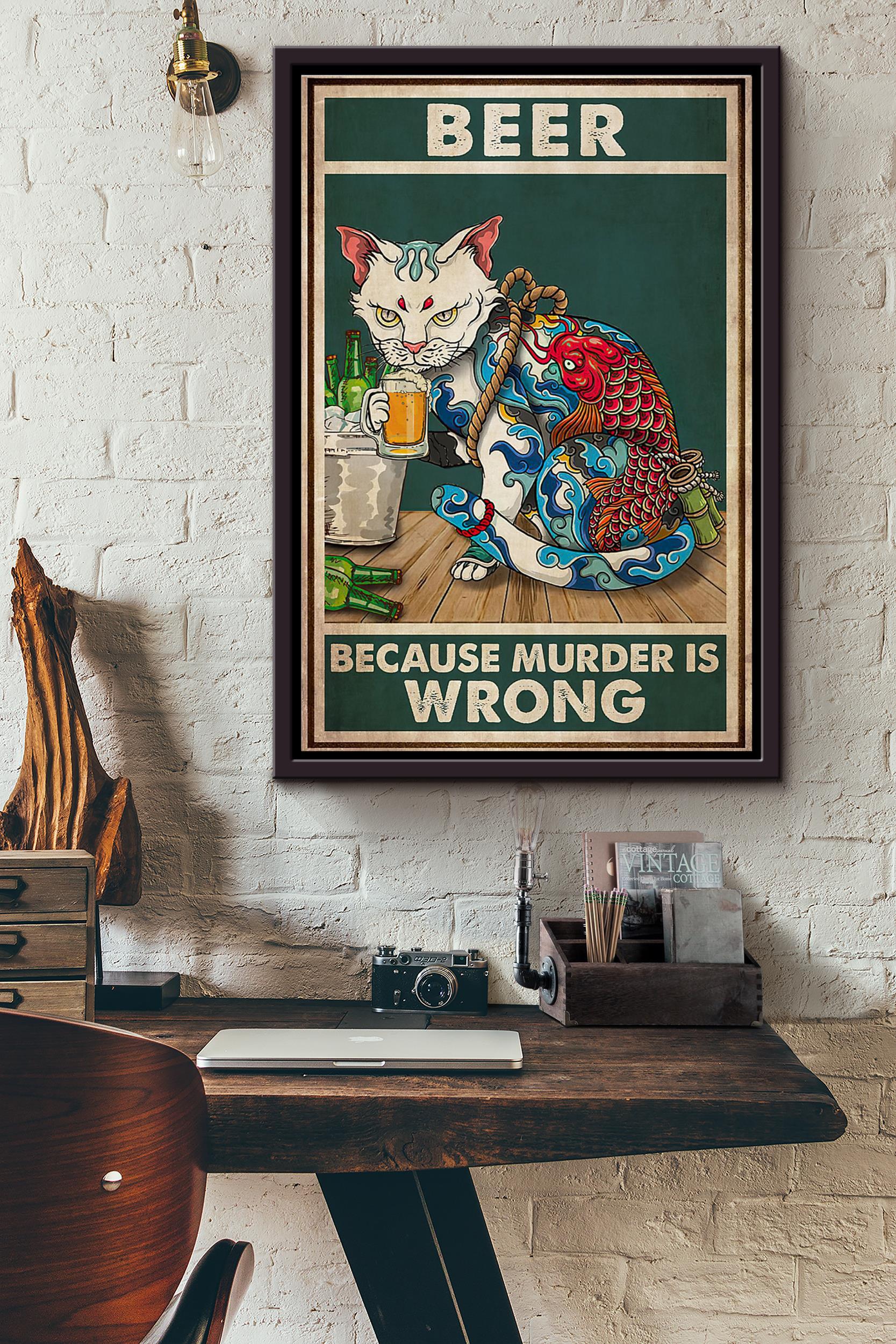Cat Tattoo Beer Because Murder Is Wrong Vintage Poster Framed Matte Canvas