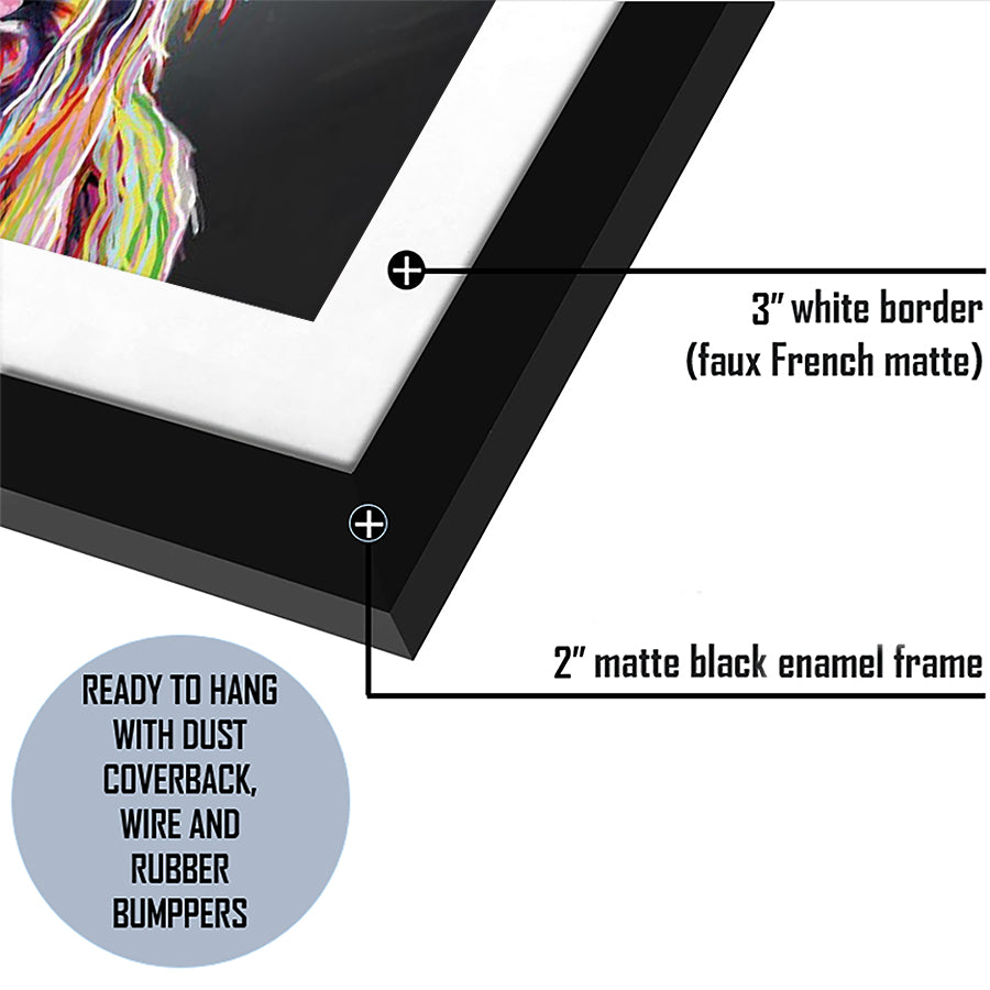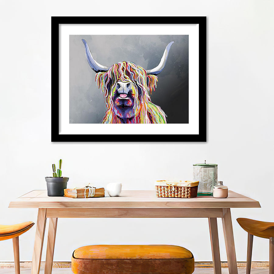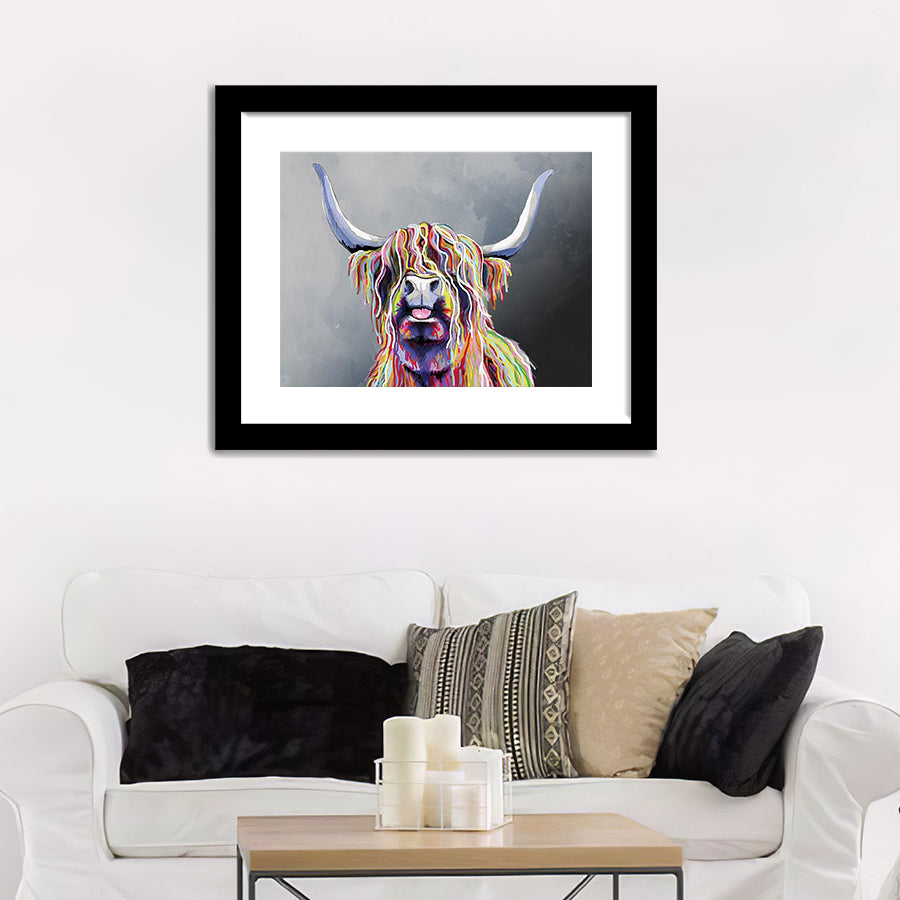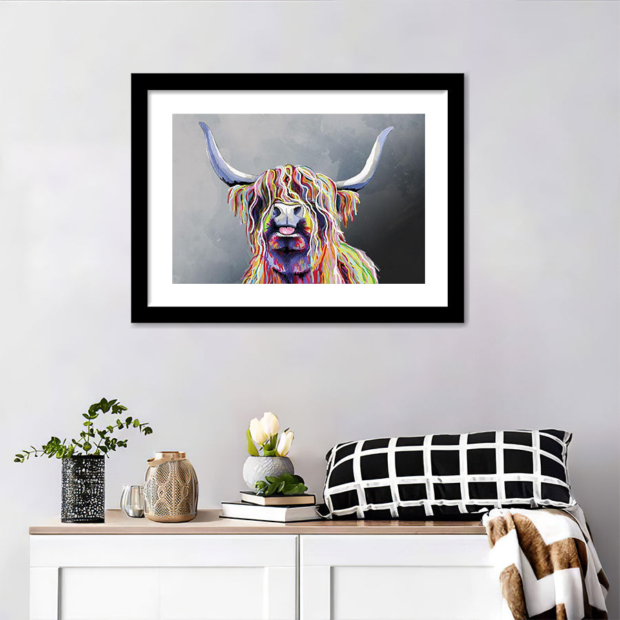 Colourful Highland Cow Canvas Framed Art Print White Border – Framed Picture, Black Frame, Painting Art, For Sale