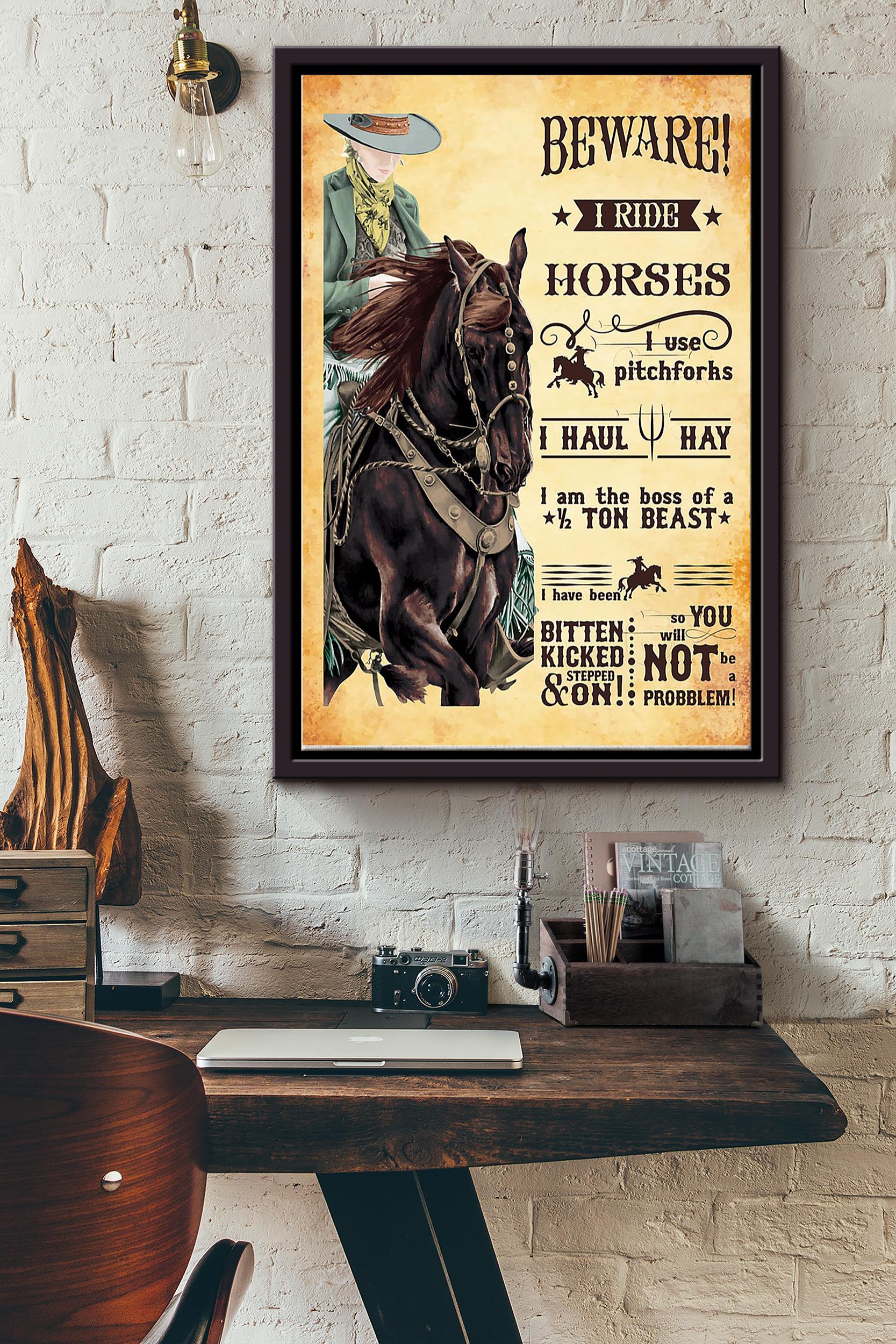Cowgirl Beware I Ride Horses Poster – Animal Wall Art – Gift For Horse Lover Horse Rider Home Decor Farmhouse Decor Framed Matte Canvas