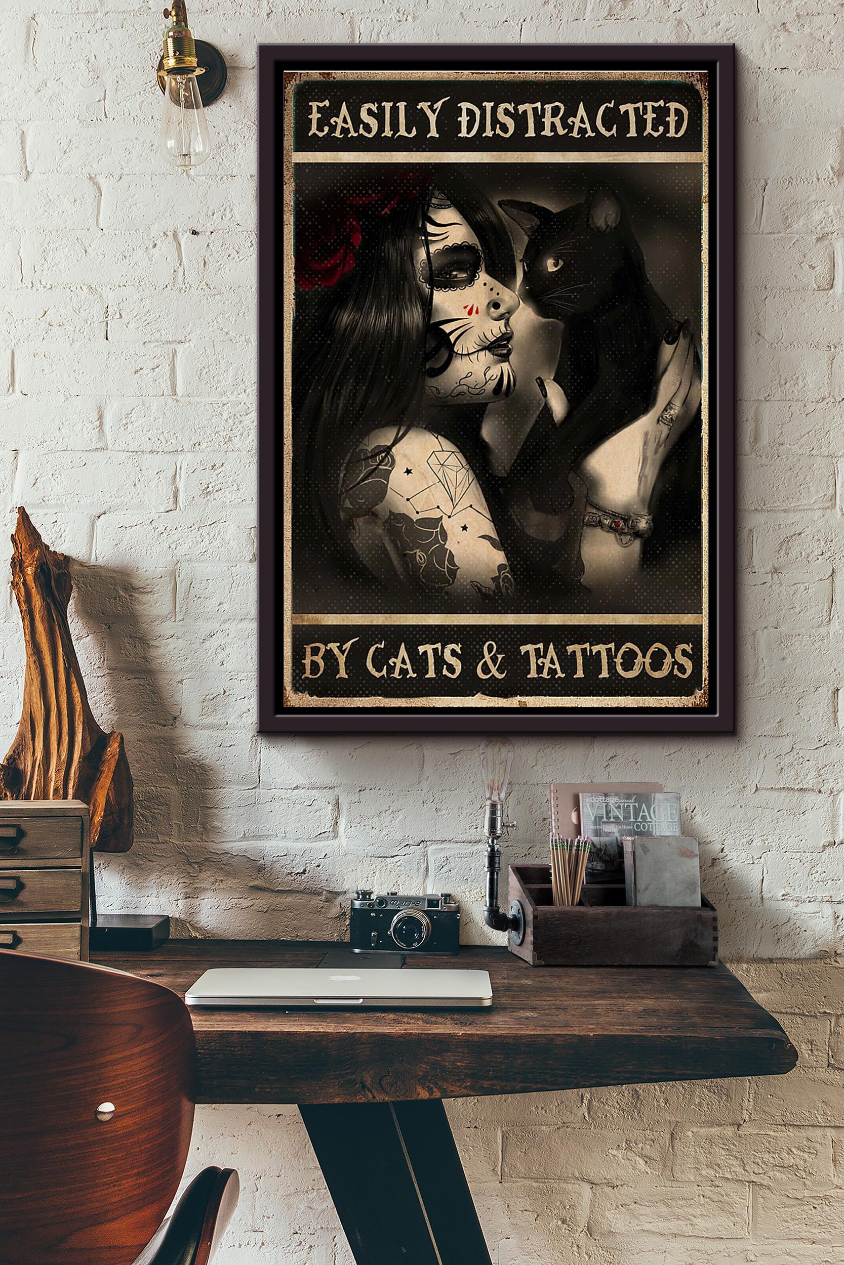 Sugar Skull Girl Easily Distracted By Cats And Tattoos Poster Framed Matte Canvas