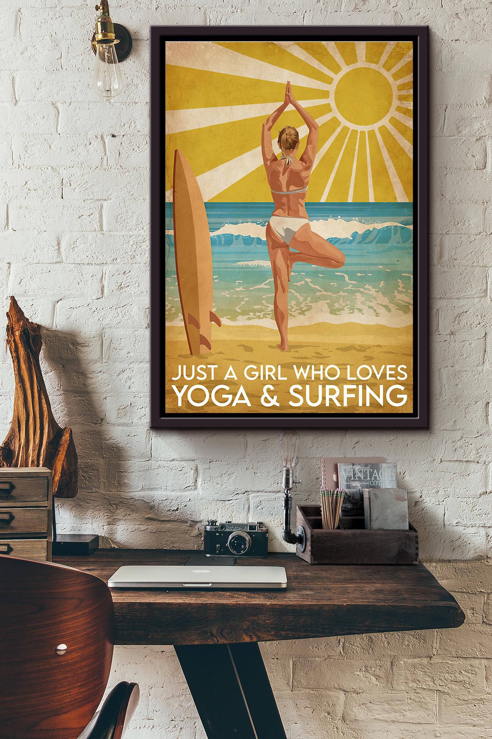 Sunburst Just A Girl Who Loves Yoga And Surfing Poster Framed Matte Canvas