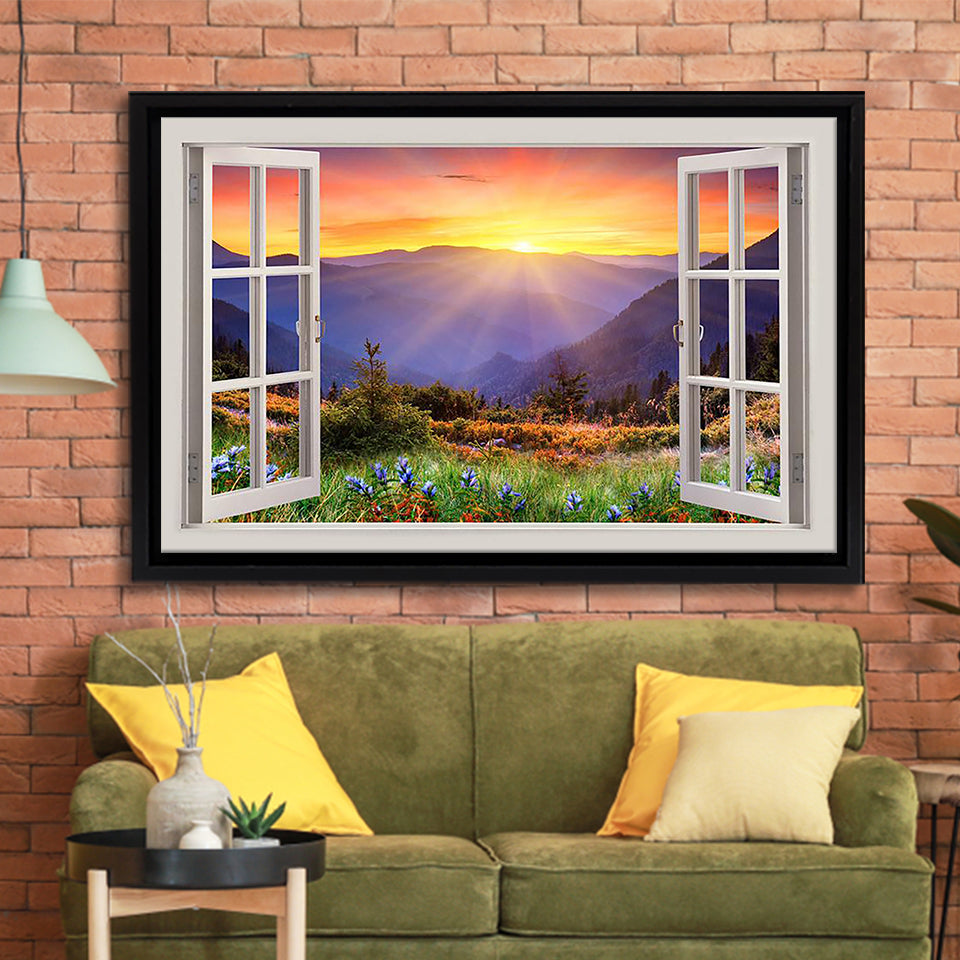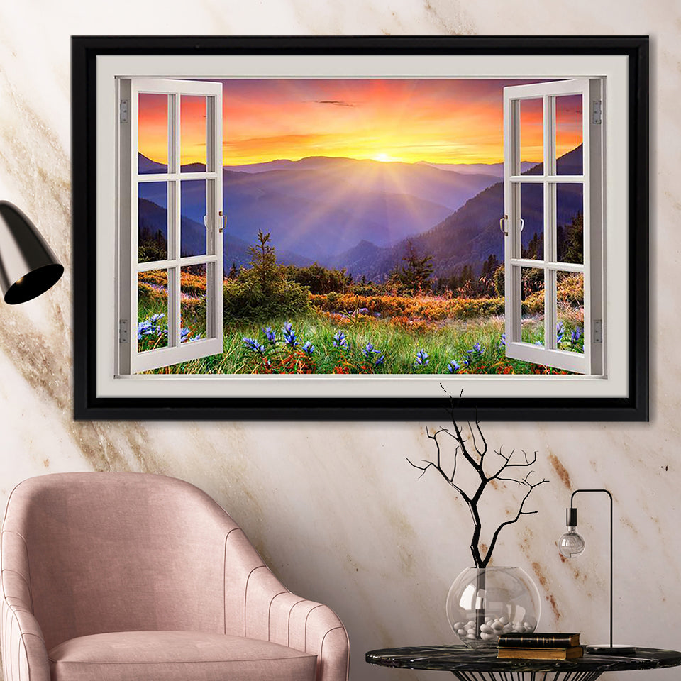 Sunrise Over Mountains 3D Window View Framed Canvas Print – Canvas Painting, Canvas Art, Wall Art, Wall Decor