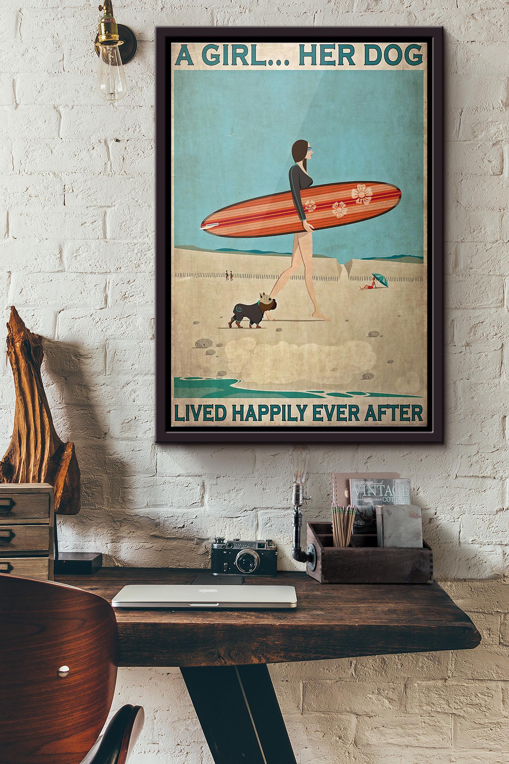 Surfing A Girl Her Dog Lived Happily Ever After Poster Framed Matte Canvas