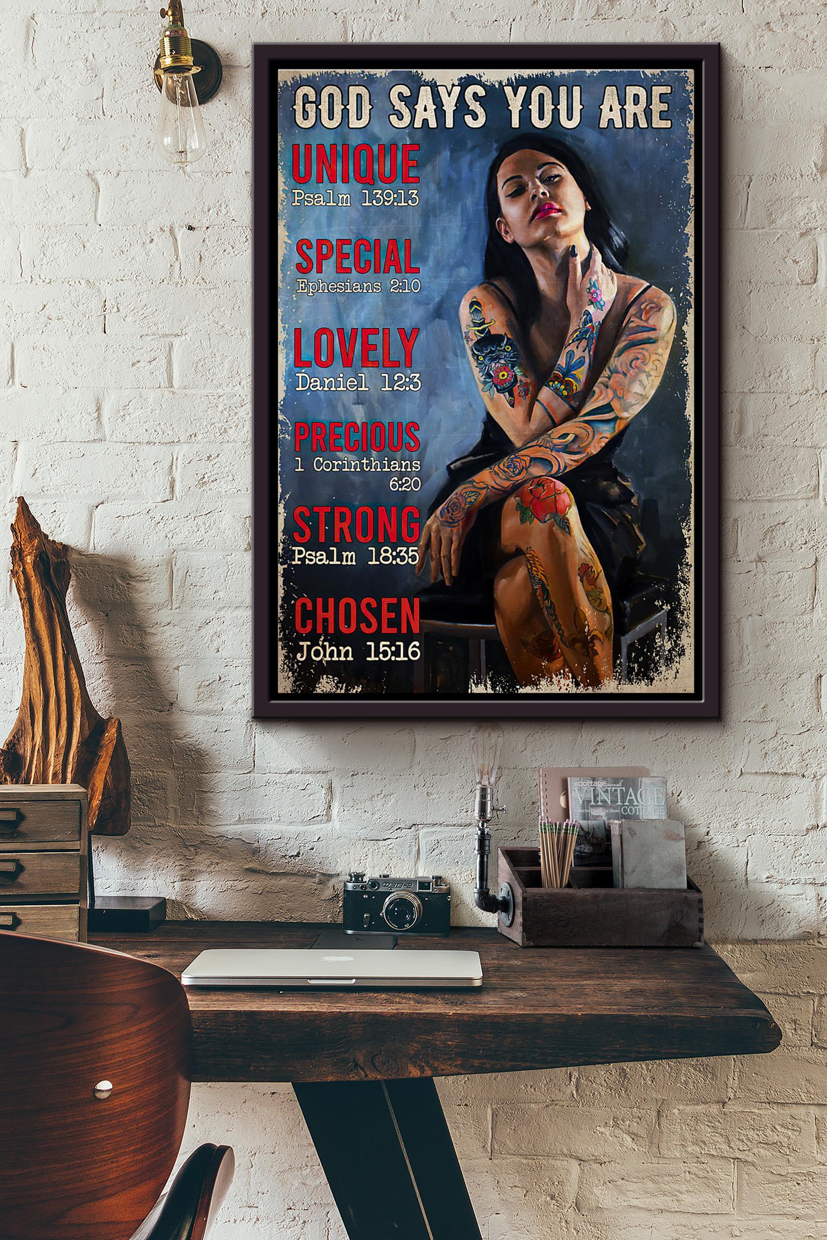 Tattoo Girl God Says You Are Unique Special Lovely Precious Strong Chosen Poster Framed Matte Canvas