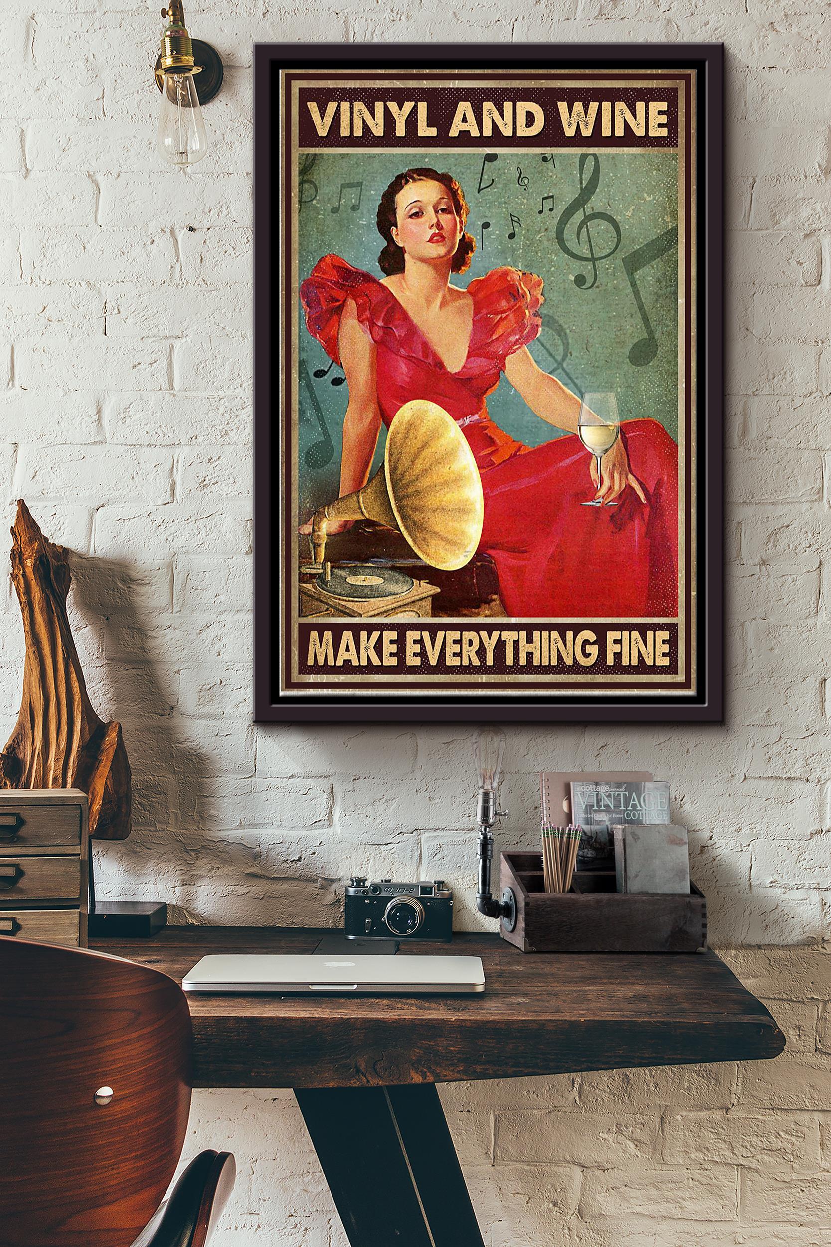 Vinyl And White Wine Make Everything Fine Poster Framed Matte Canvas